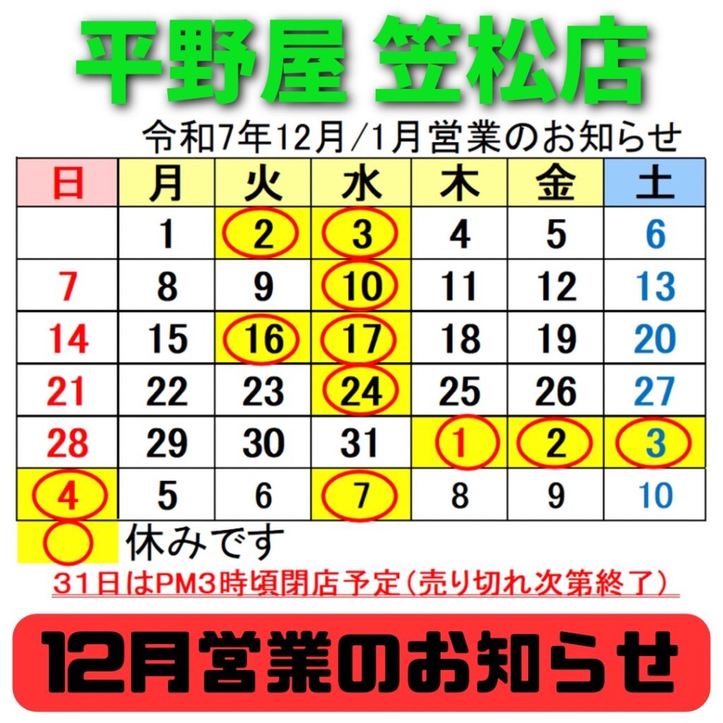 平野屋 笠松店より12月営業のお知らせです⋆͛📢⋆
