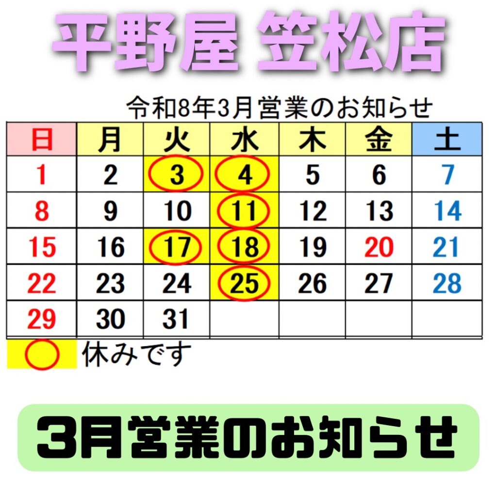 平野屋 笠松店から3月営業のお知らせです📢